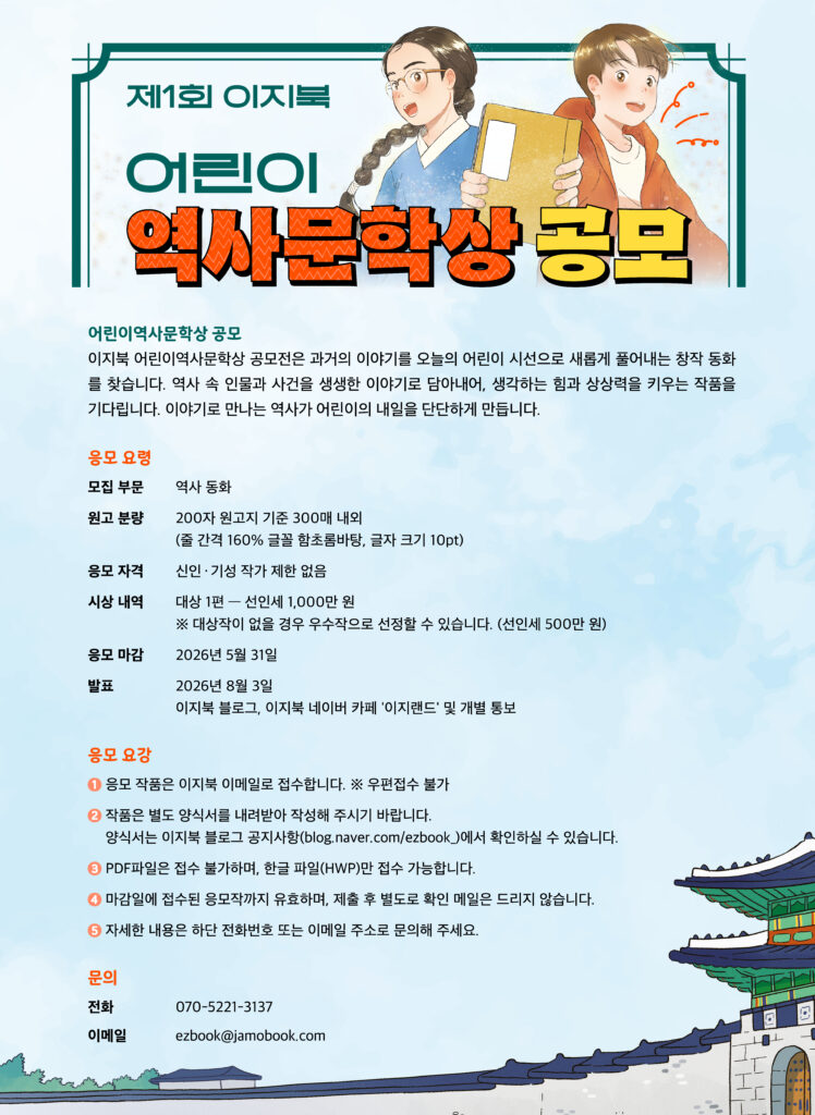 이지북 어린이역사문학상 공모전은 과거의 이야기를 오늘의 어린이 시선으로 새롭게 풀어내는 창작 동화를 찾습니다.